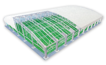 建物は膜構造建築ですので、開放感にあふれています。膜材を通過した光は、拡散光の柔らかい光となって、室内を均一に明るくします。ボールが見やすく、プレーに最適な空間となります。また、有害な紫外線も大幅にカットするほか、直射日光が避けられますので、熱中症の予防にも効果的。ジュニアやシニア層の方々にも優しいコートです。